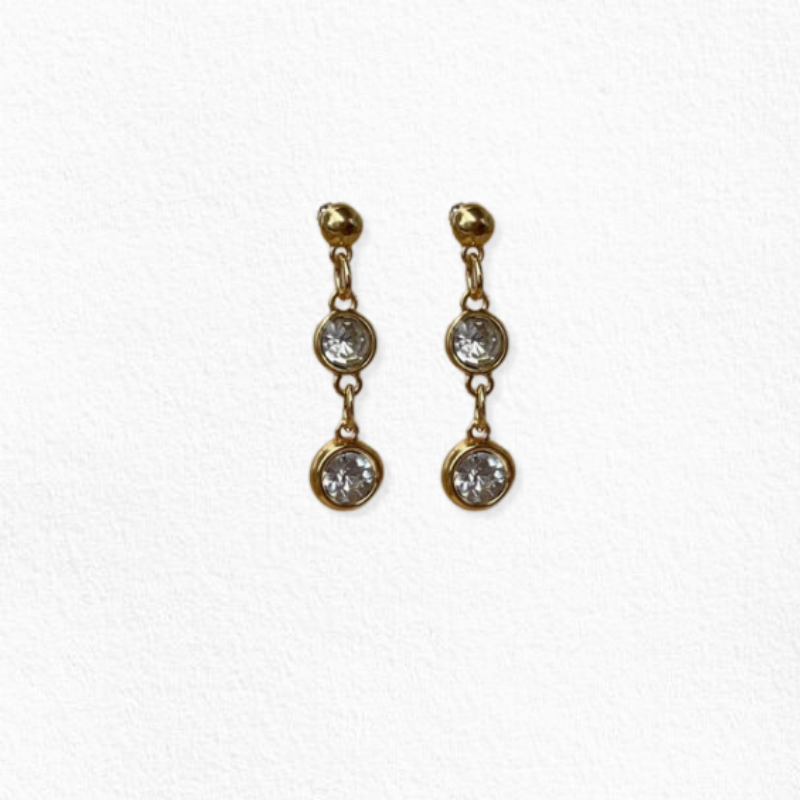 Brinco dourado com tarraxa e dois pingentes com strass transparente. Tamanho: Aproximadamente 4,5 cm.